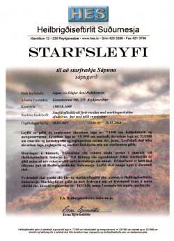 28. mars 2012 Starfsleyfi Sápunnar Hér til hliðar má sjá starfsleyfi Sápunnar sem afgreitt var á 229. fundi Heilbrigðisnefndar Suðurnesja 22. mars s.l. Þetta fallega skjal verður nú hengt á áberandi stað í nýju sápugerðinni. Það má skoða skjalið með því að smella á það. Þá stækkar myndin.