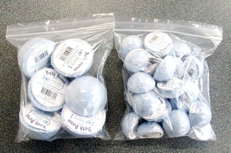 Verslanir geta pantað eitt stykki eða svo mörg sem þær vilja. 90 gr. baðbombum er pakkað 6 stk. í rennilásapoka og 20 gr. baðbombum er pakkað 24 stk. í rennilásapoka. Allar baðbombur eru með strikamerkjum og lotunúmerum.