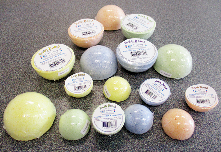 Baðbomburnar eru framleiddar sem hálfkúlur, 90 gr. og 20 gr. með ilmkjarnaolíum. Saltið í baðbombunum er íslenskt sjávarsalt. Við leggjum áherslu á að til sé á lager baðbombur með "Lavender", "Lemon", "Orange" og "Peppermint". Aðrar ilmkjarnaolíur er hægt að fá í bombunum ef óskað er sérstaklega.