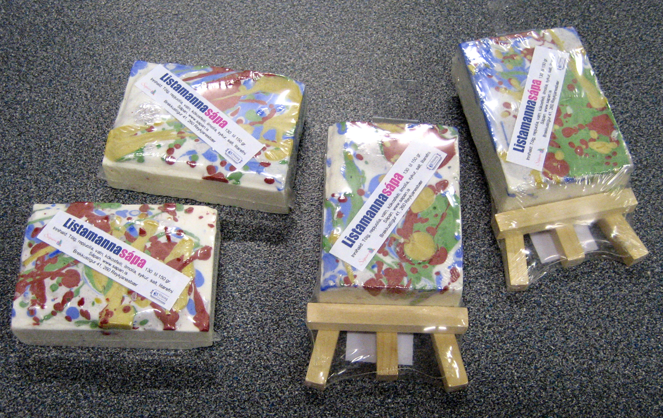 Sápan er sérstaklega blönduð með lista- og handverksfólk í huga sem þarf að þvo sér oft um hendurnar. Hún er að sjálfsögðu góð fyrir alla sem þvo sér oft. Sápan er mild og ilmurinn einnig. Trönurnar eru góðar til að geyma sápuna svo renni vel af henni eftir hvern þvott. Smellið á myndina til að stækka hana.